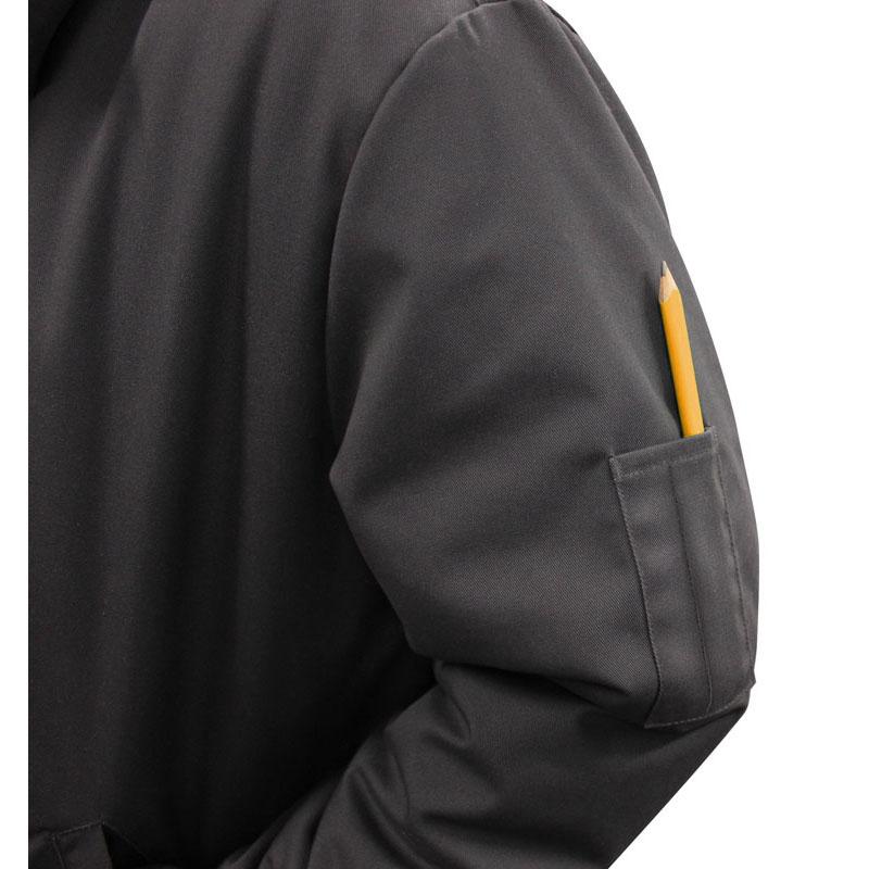 *65% Polyester/35% Cotton workwear twill *9.2 oz. *100% Polyester quilted taffeta lining *2 oz. 100% Polyester insulation *Wrinkle-resistant fabric *Easy-care stain-release finish *Front welt pockets *Hidden interior pocket *Pencil pocket on left sleeve *Button adjustable cuffs & hem *YKK® metal center front zipper *Regular fit